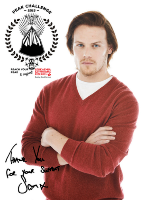 In general, I am not necessarily a fan of some stars who are vocal about their political and/or world view beliefs which they sometimes erroneously (in my opinion) wrap around some charitable cause. I tend to ascribe to the "Shut up and Sing…or Act…or whatever it is you do" philosophy. However, I do appreciate that Sam Heughan seemingly keeps his eye on the ball (or balls per Cahonas Scotland!) and uses his fame to raise awareness and funds for meaningful disease prevention and eradication. I could do without his occasional shout outs to the SNP and/or Syrian refugee situation, but that's my pet peeve, I suppose. It's interesting to see that Sam's work with Bloodwise, #MyPeakChallenge, etc. seems to ground him and perhaps that's also a very good reason why I hope he continues with these endeavors. It's a lot for a 35 year old, relatively obscure actor to get thrust into the limelight like Sam has and not to…well, just become an a-hole. But, Sam was and is a good guy. Raised right it would seem and has his priorities straight. I applaud him for that and hope he continues inspiring both others and himself to know that life doesn't revolve around any of us individually and there is so much work to do when it comes to overcoming heinous diseases such as cancer. Bravo, Sam.