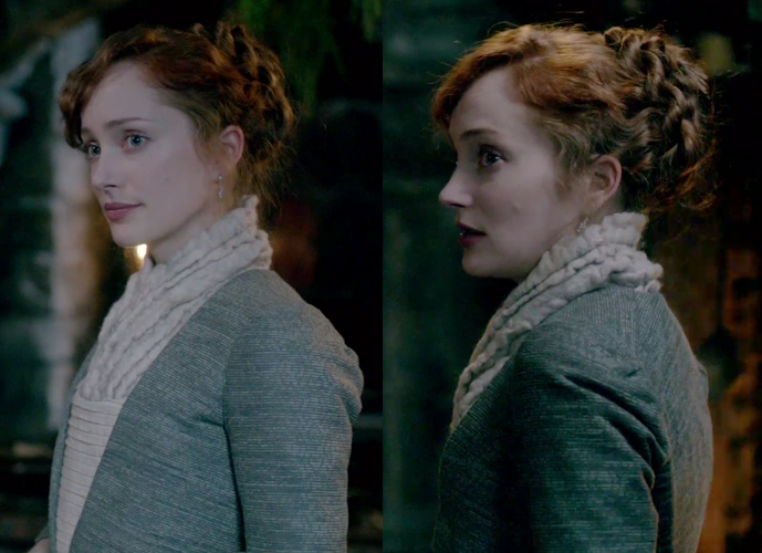 As noted in the quote above, married women of the time wore their hair up and off their neck. Working women typically styled this very simply, and wore a kerchief or cap over top. It’s interesting how show Jenny doesn’t do this. She has an updo, but it isn’t simple and it isn’t covered. Show stylist Annie McEwan described in an interview once how she researched the characters’ hair, and from these comments it seems like she styled Jenny as an upper class woman would appear. These women had more braids and softly curled tendrils as decorations. Jenny is the sister of a laird, after all, albeit a minor one. So even if show-Jenny doesn’t match her description in the books, her style wouldn’t be too historically unprecedented.