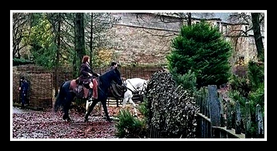 Another scene in preparation to film with Claire, Jamie and Murtagh in the background. This is possibly Lallybroch.