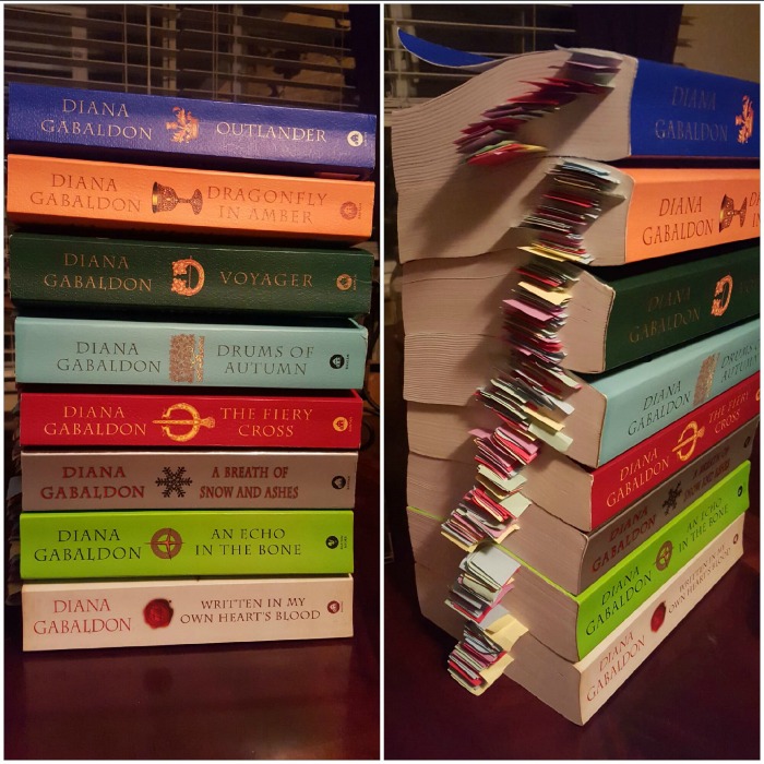 This is Martha… This is Martha’s 2nd read-through of Outlander… Martha replaced all her paper bookmarks with Post-It bookmarks… Martha is obsessed with Outlander… Martha has an addiction… Don’t be like Martha……. LOL!