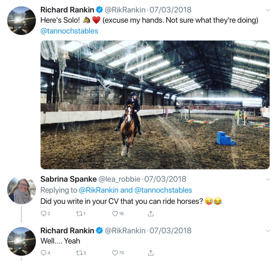 We’ve all heard the jokes about actors putting on their CV that they can ride horses, which can often be just a wee exaggeration! Recently Richard Rankin tweeted that they had him out learning to ride!