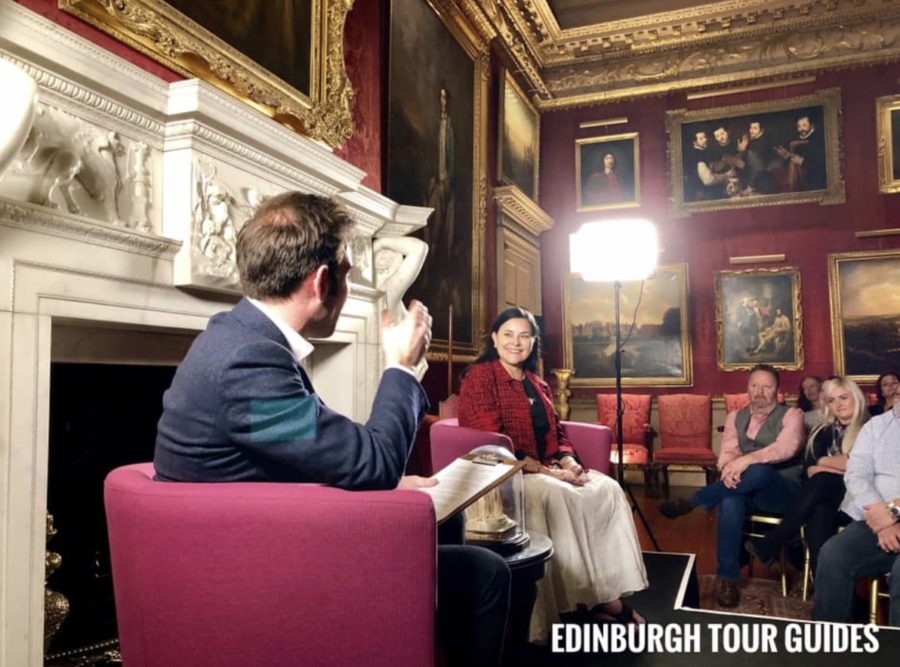The evening with Diana Gabaldon was hosted by James Crawford, broadcaster and chair of Publishing Scotland. The event was held in the very room where Claire, Jamie and Murtagh had their conversations/confrontations with the Duke of Sandringham. Angela Gourlay of Parkhead House and Sam Thomson of Edinburgh Tour Guides snapped up their tickets (which sold like the proverbial hotcakes) early, and here they are meeting Diana Gabaldon with their respective husbands.