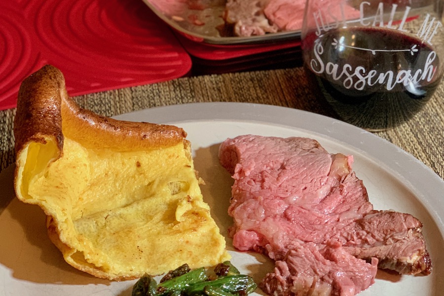 This meal was our version of a traditional English Sunday dinner, roast beef and all. The Yorkshire pudding was lightly eggy, with crispy brown edges and a wonderful flavor that complemented the meat. No wonder it’s the traditional side dish! I’m sure Lord Thomas and his men enjoyed their meal as Claire regaled them with how she came to be in Scotland. Meals make memories, and favorite dishes become traditions. I’d love to hear about yours!