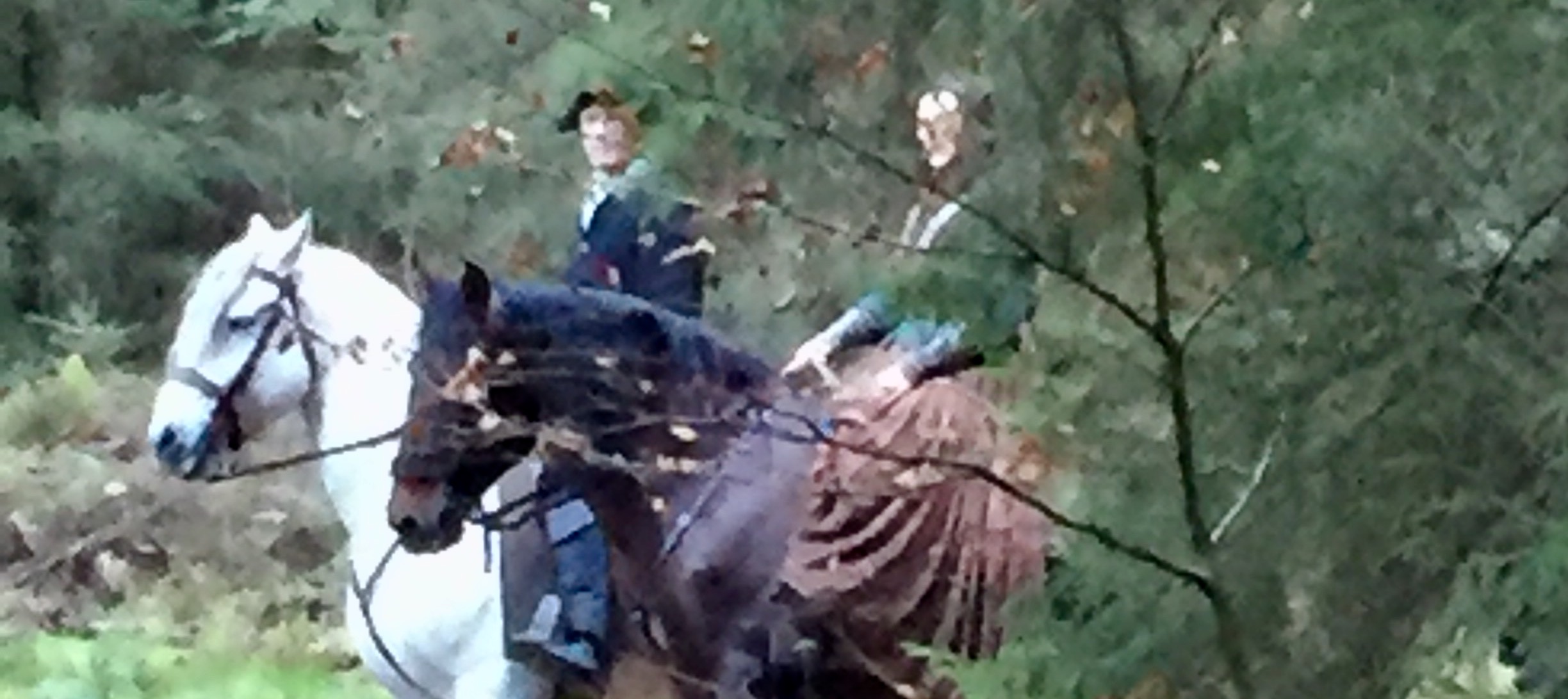 Here are some pictures I took—sorry, low light and forest-like conditions—and they are all of Sam Heughan and Caitriona Balfe returning to their starting point for the scene. This, of course, was played out over and over again. During the filming, we had to go way back into the forest and hide behind trees, (thanks Morag and Sandy for lending me the binoculars!) and when they were heading back we could come out into the open and I could take some pictures.