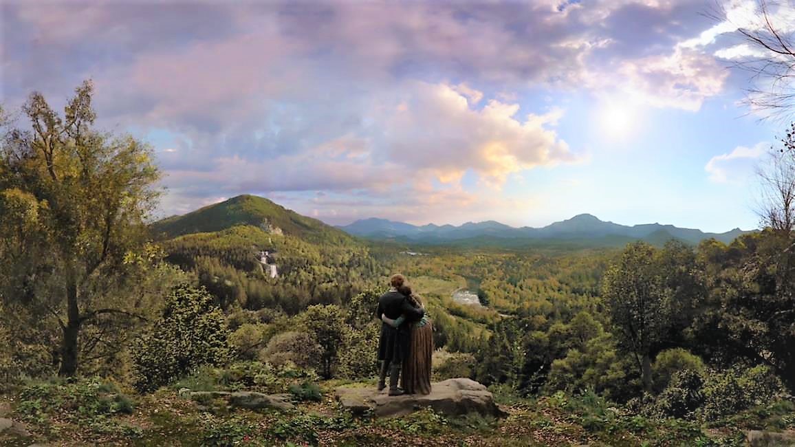 Another anxiety-producing notion that I conjured about Outlander Season 4 was probably something that Jamie and the others may have felt as well. What would this new land look like? Would we find the beauty and the majesty of Scotland or would it pale in comparison? I have traveled to the “highlands” of North Carolina and I know how beautiful it is. Vast views across the Blue Ridge and Great Smoky Mountains are breathtaking, particularly in autumn. This re-creation of North Carolina while actually filming in Scotland had me intrigued. Of course, I thought, the production scouts could find comparable looking terrain in Scotland, as there are many similarities. This was my hope.