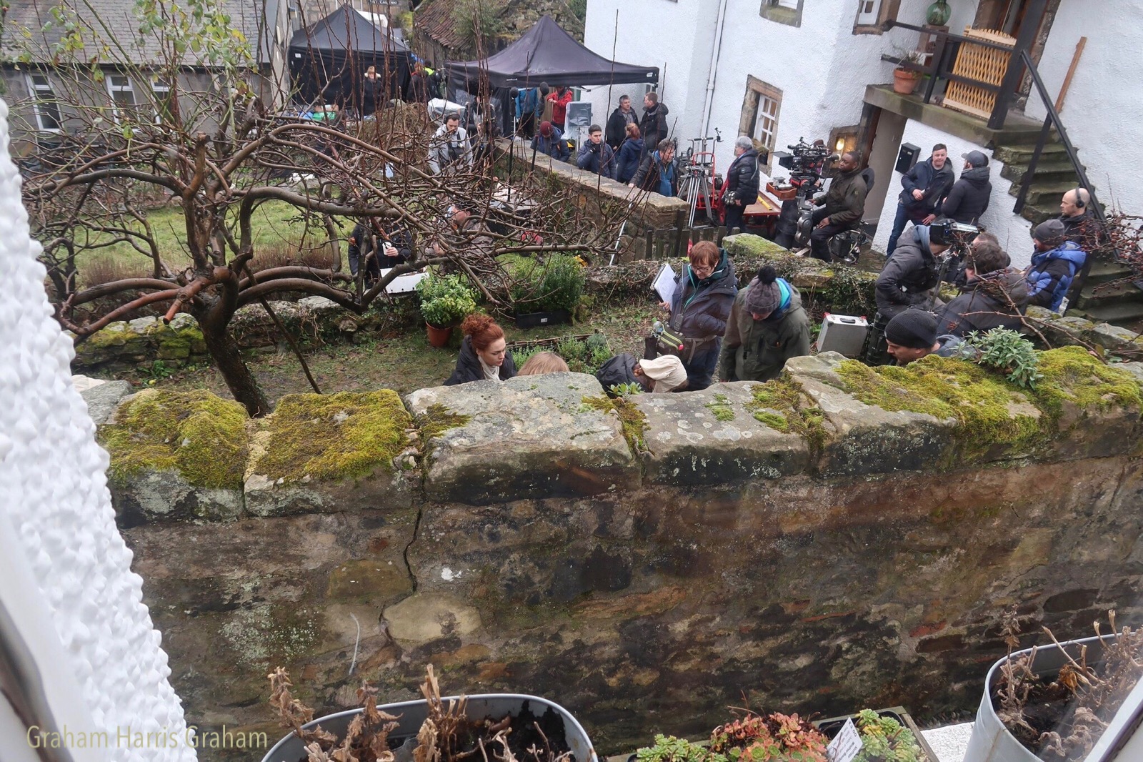 The filming took place over two days in February 2018. On the first day, Graham Harris Graham (well known local photographer who specialises in Outlander-related photography), Lee Jenkins and Julie Windmill were there on the spot, and shared their pictures with me. Graham’s Gallery is right above the Culross Palace (National Trust for Scotland) shop and right in the centre of the village. He could look out the window of his home to see the filming on Day 1. Talk about lucky.