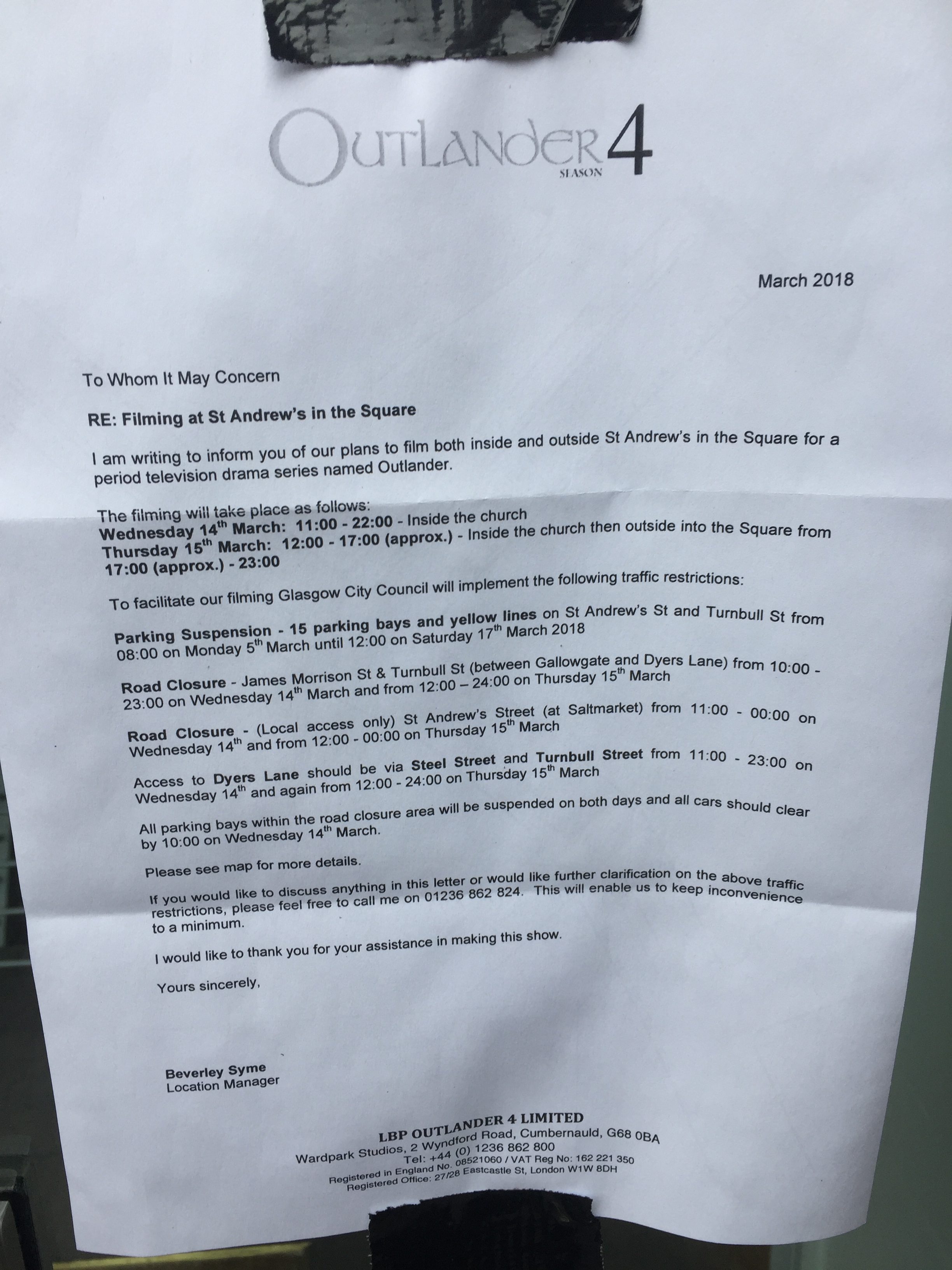 So, for this episode I can bring you the sights and sounds of filming that took place in Glasgow city, earlier this year in March. Social media channels alerted us that filming would take place in Glasgow over two days and, yes, I spotted this on my reconnoitre. Advance warnings of street closures and traffic diversions. The location was the beautiful St. Andrews in the Square.
