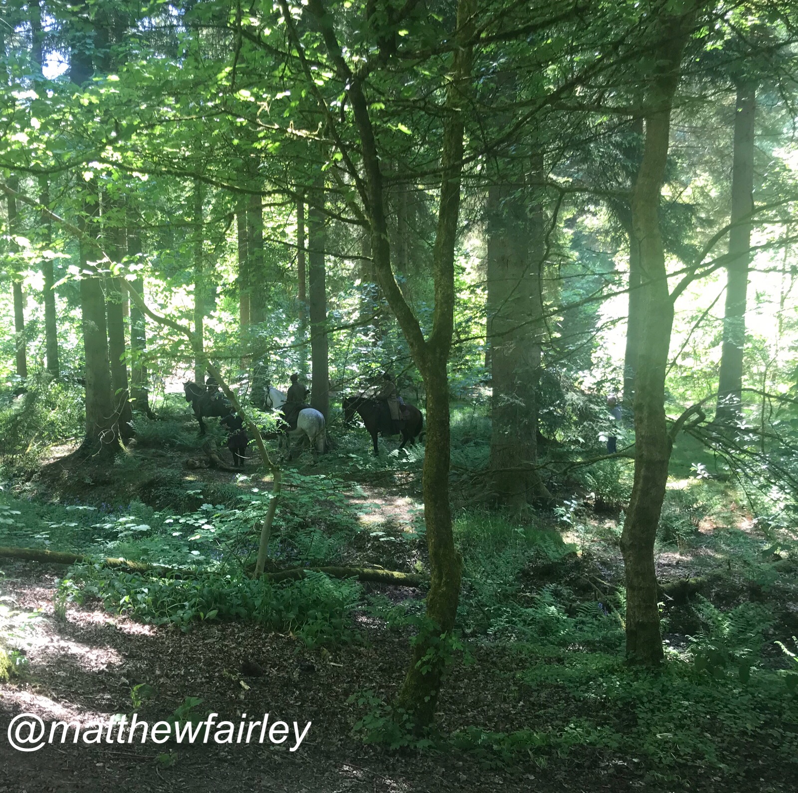 The scenes with our intrepid threesome searching for Roger — and that heart-rending voiceover by Jamie — were filmed at Cumbernauld Glen on that sunny day when we watched the filming last May. More details of that and lots of fan pics can be found in my last post. Matthew Fairley spotted the three weaving in and out of the trees on horseback.