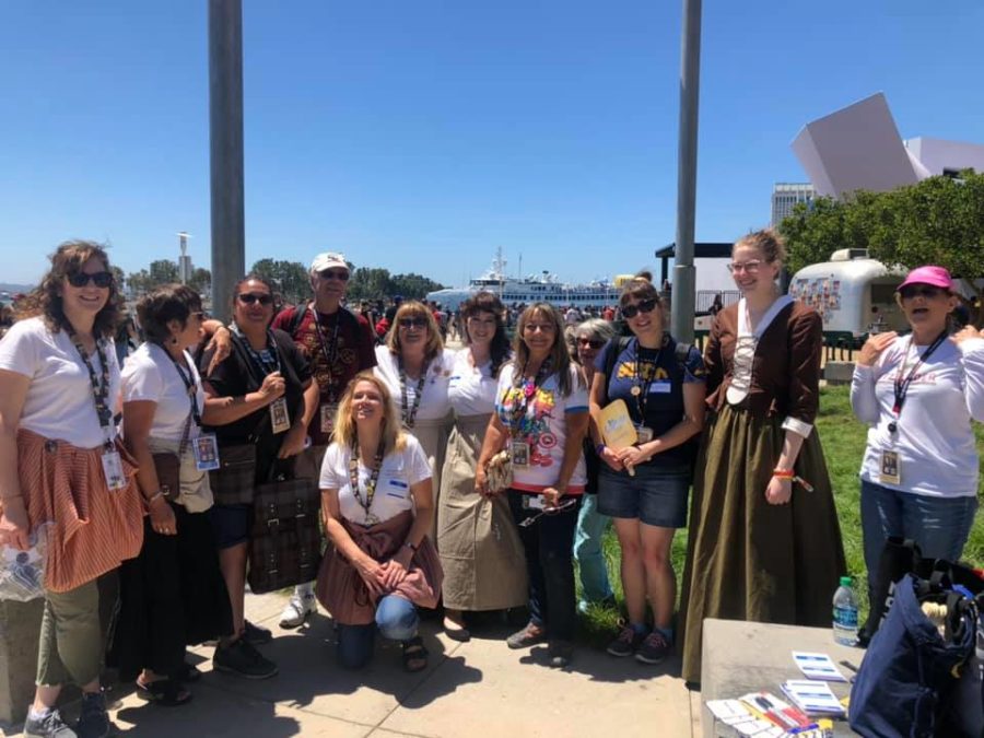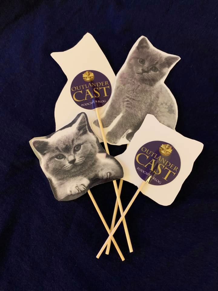 Finally, we created an Outlander Meet Up event on Saturday for anyone to join! Because Lisa M, Marlo and I couldn’t attend the fan panel, we wanted to make sure we could still celebrate Outlander and meet other fans. Lisa M was fabulous and created fantastic goodies for us to hand out, including cutout Adsos, trading cards on American history and Fraser’s Ridge buttons. She even made shirts with The Fiery Cross (the book that season 5 will be based on) logo for us to wear!