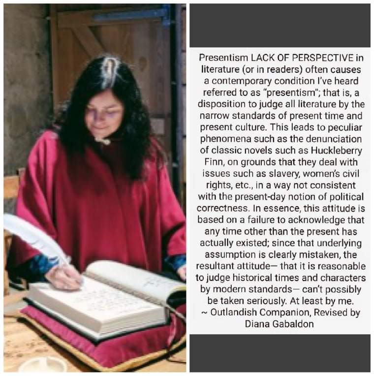 Readers and viewers are not the only ones who can fall into this trap; authors and scriptwriters can as well. A fearful writer might sugar coat actions they don’t like (or think their audience won’t embrace). A biased writer may purposefully skew reader/viewer perception toward a current cultural norm or political statement. Even Outlander writers often give a current “cleanse” to the book material. (More on this later). Presentism manifests itself in several ways and often obstructs your ability to truly appreciate this genre..