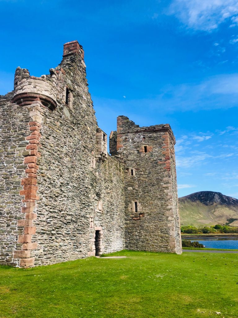 It’s actually hard to make out much of the ruins at Lochranza. The castle interiors are badly damaged although the exterior edifice remains imposing. I found myself most impressed with the position the castle occupies on the small promontory of land that juts out into the bay. There are beautiful views from all sides – the mountains of Glen Rosa to the rear and the Sound of Bute to the front. The lack of definition of the interior ruins, however, makes it that much more fun to imagine the castle in its hay day. It was a blustery day when we visited, but we enjoyed our wander around the castle and the sound of the wind and the waves. We punctuated our visit with a few windy wee selfies in front of the castle. Lochranza’s charm lies in its beautiful, picturesque setting. We were fortunate to visit on a sunny day when the castle can be seen in its best light.