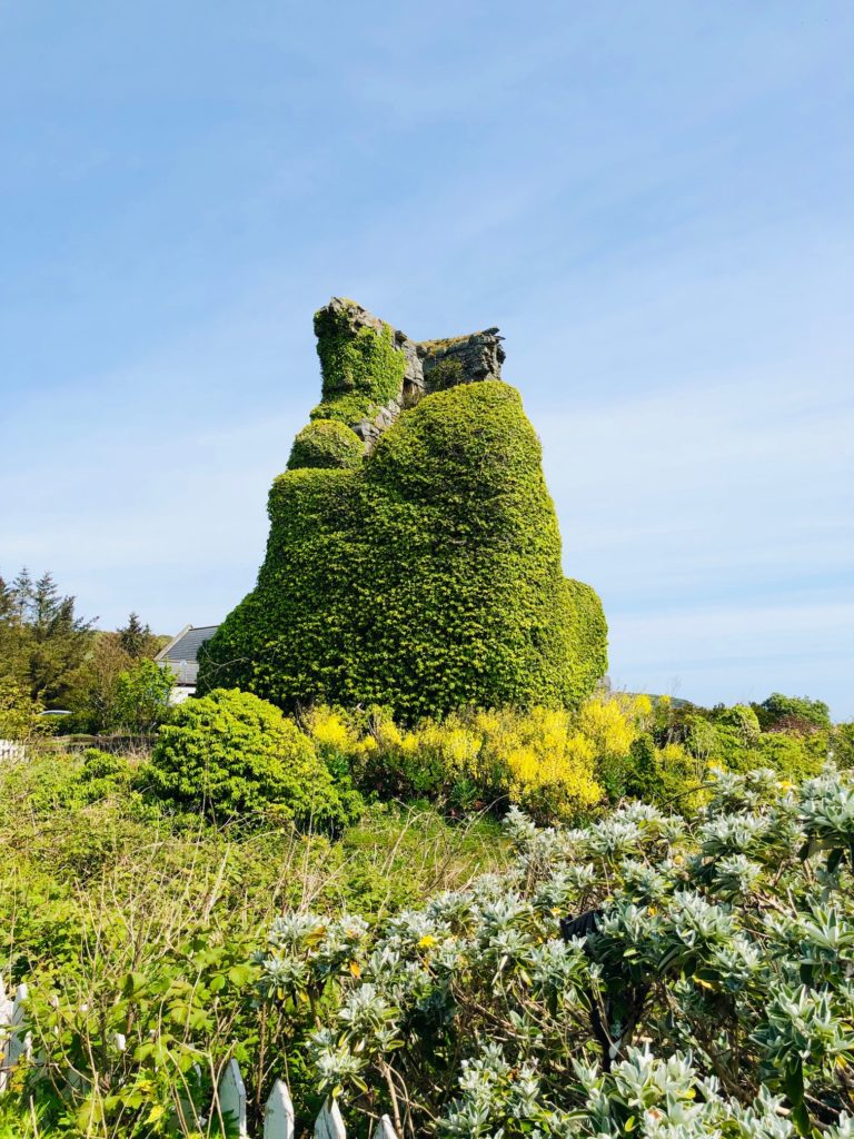 Last but not least, quirky Kildonan Castle lies in the small village of Kildonan on the southern coast of Arran. The castle’s name is derived from the name of a former resident, Irish monk Saint Donan, who is said to be buried on the island. I have made two trips to Kildonan and am astonished each time that what remains of the castle manages to remain standing. You have to park about a quarter mile away and then walk down a dirt road to the castle. Don’t miss the “Wee Gallery,” which you will pass just before arriving at the castle ruins. The remaining tower of Kildonan Castle literally teeters on the edge of a rocky plateau above one of Arran’s few sandy beaches. You can see the small islands of Pladda and Ailsa Craig in the distance on most days from the castle. The castle ruins are covered in green ivy making it hard to even discern its stone skeleton.