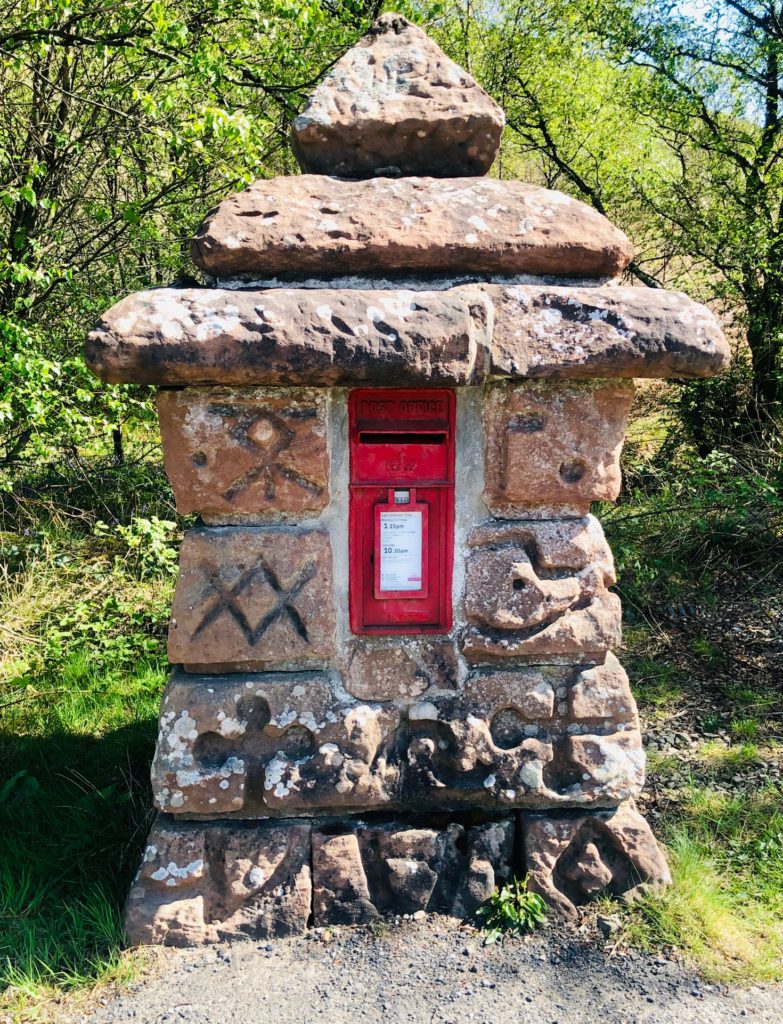 There are a number of chambered cairns and ancient mounds along the road although most require an archaeologist’s eye to spot. At the bottom of the southern part of the route, we stopped to take a snap at probably one of the fanciest and oddest looking letter boxes I had ever seen. The story goes that at one time the post box was painted white. One day the Laird’s daughter came riding by on her horse. The white box gave the horse a fright and presumably the Laird’s daughter fell from her horse. After this unfortunate incident, the Laird hired a stone mason from Ayrshire to build the striking carved replacement. So far no one has been able to make any meaning of the carved symbols on the post box. The box remains a famous landmark along the String Road and likely one of the most photographed.