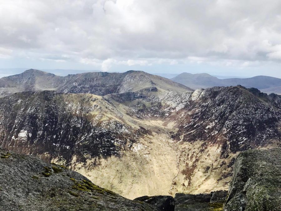 Just below the summit is a granite boulder field that seems never ending. Heart, lungs and knees are tested as the summit draws near. The boulder scramble prior to the summit is the hardest part of the ascent, but by that time you’ve gone too far to give up. I’ll never forget the variety of weather we experienced on that climb. We started off in t-shirts and near 70F temperatures and ended with snow, sleet and 20-mile per hour wind gusts. I am not kidding! As with any hill walking in Scotland, you must be prepared for all kinds of weather. I would never have believed it to be true, but that day we truly did experience all four seasons on that mountain. As mentioned, views at the summit are truly other-worldly. Misty clouds drift lazily between the peaks of Glen Rosa down the north side of the island and on a clear day you can make out the Paps of Jura, Ben Lomond and even Northern Ireland. The panoramas are spectacular and provide a clear example of a landscape shaped by ancient glaciers.