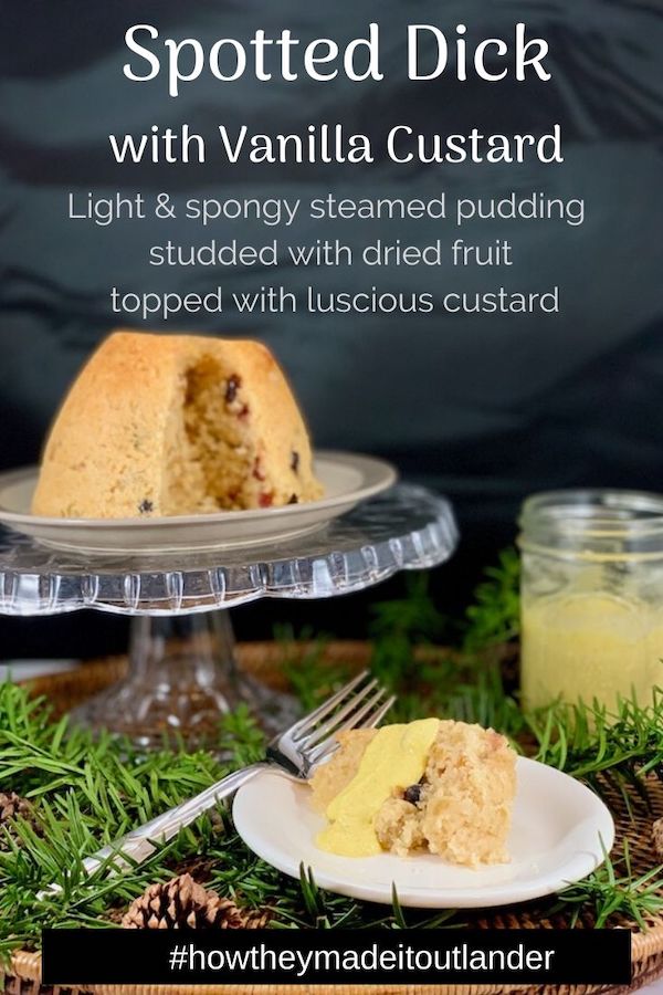 Even though spotted dick isn’t technically from the 18th century, I can imagine that Claire would have been familiar with spotted dick and accustomed to having it with a custard sauce. Since the denizens of the Ridge would have known about boiled puddings, I thought it acceptable that she might have made it herself or told her (soon-to-be-revealed) cook about it. The recipe I chose for Claire’s spotted dick came from Sorted Food (here’s their accompanying video). Whether she made it for Christmas or at another time is a different subject altogether.