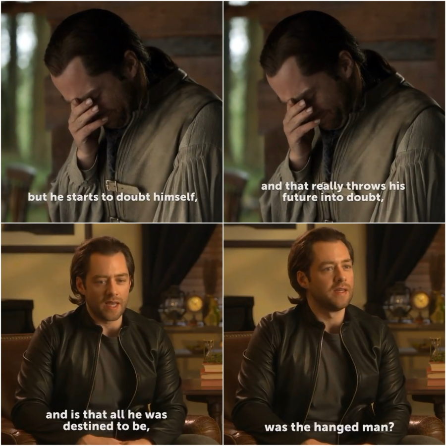 Roger does return to Brianna with new hope in his eyes and he seems to have lost the “thousand yard stare.” He tells her he will not be the same, but he will be there. Back to the “hanged man” definition above, it seems he is letting go, breaking old patterns, and perhaps undergoing a metamorphosis. Time will tell.