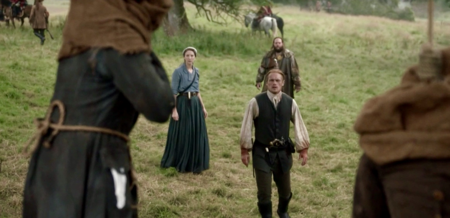 Roger’s strength is in his voice: he is a singer (and they sure let us know that!) and a communicator (a history professor forbye). He can calm the ugliest of the drunken Brownsville oafs with his happy tunes. And in Outlander Episode 507, “The Ballad of Roger Mac,” he uses his skills to cross into the enemy camp to negotiate with Murtagh, as leader of the Regulators. Roger volunteers for this dangerous mission perhaps in large part to prove himself to Jamie Fraser, to prove to his father-in-law that he is fit to be a captain in the militia.