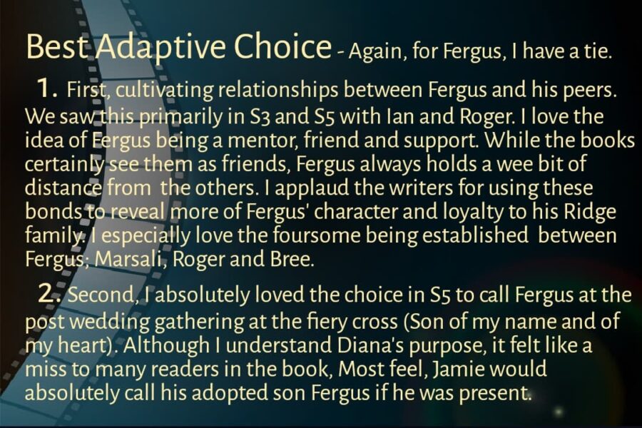 While wonderfully performed by all three actors, the characterization of Jamie’s love for Fergus and Marsali bothered me, earning this storyline one of my two worst adaptive choices for Fergus.