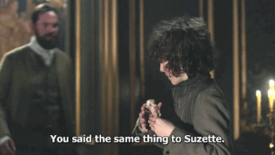 He leaves ahead of the Frasers with Murtagh, but glows with joy when Milord and Milady arrive. Berrux really emotes the immense love Fergus feels for Jamie and Claire.